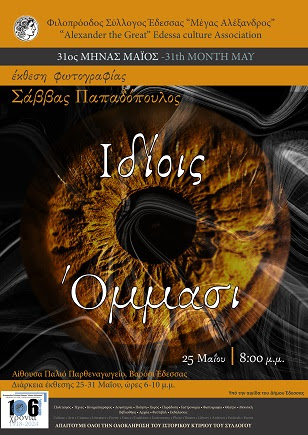 Με την έκθεση φωτογραφίας του Σάββα Παπαδόπουλου ολοκληρώνεται ο 31ος Εικαστικός Μήνας Μάϊος, που διοργανώνει ο Φιλοπρόοδος Σύλλογος Έδεσσας «Μέγας Αλέξανδρος» υπό την αιγίδα του Δήμου Έδεσσας.